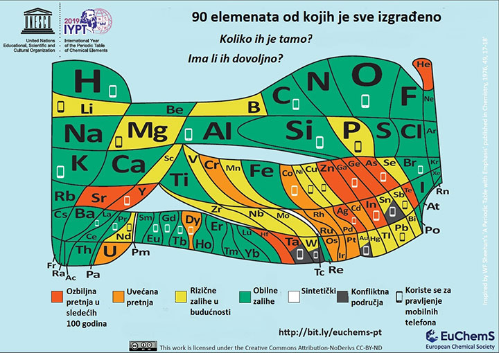 На предлог УН, 2019. се у свету обележава као Година Периодног система хемијских елемената, који је 1869. осмислио руски хемичар Дмитриј Иванович Мендељејев. У Парламенту Европске уније је јануара 2019.  Разгварали су о прекомерној експлоатацији и потенцијалном дефициту значајне групе хемијских елемената на нашој планети у скорој будућности.  Нови изглед периодног система елемената је дебитовао у Европском хемијском друштву (ЕХД) које окупља више од 160 .000 хемичара Европске уније. За разлику од ПСЕ на зидовима свих кабинета хемије у свету, који садржи 118 познатих природних и синтетичких елемената што чине свемир са једнаким простором за сваки, нова табела различитим простором релативизује заступљеност и нестајање 90 природних елемената на Земљи